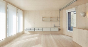The upper level is constructed with crosslaminated timber panels, which is a more flexible way of prefabricating with fewer materials involved and allows for simple assembly. The large building elements involved also mean fewer joints, which means less likelihood of air leakage, improving the airtightness of the building