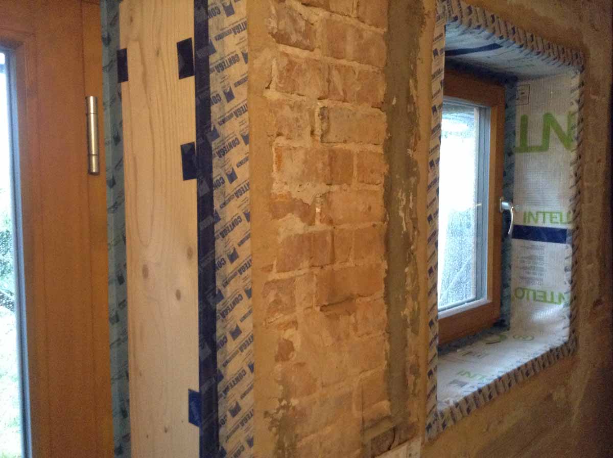 Airtightness taping and membrane around windows, with the original brickwork still exposed internally