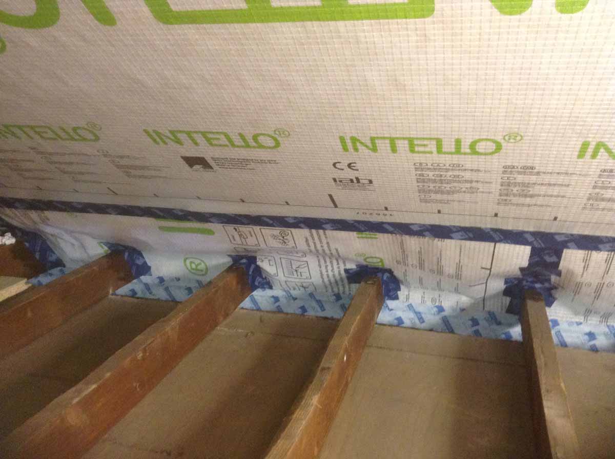 The Intello vapour control membrane of the roof was lapped down and also taped to the internal brickwork, ready for the plaster. Similarly, the plaster came down over the damp proof membrane (which was covered in Contega tape to ensure the plaster stuck to it) that lapped up from under the ground floor.